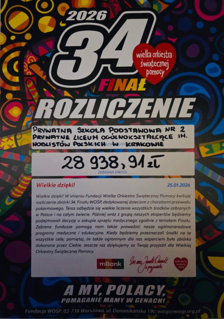 Dzięki wspólnemu zaangażowaniu udało się zebrać 28 938,91 zł – kwotę bardzo wysoką w historii naszych działań na rzecz WOŚP. To najlepszy dowód na to, że działając razem, możemy osiągać realne i piękne rezultaty. Serdecznie dziękujemy wszystkim za okazane wsparcie, energię i ogromną moc wspólnego działania.