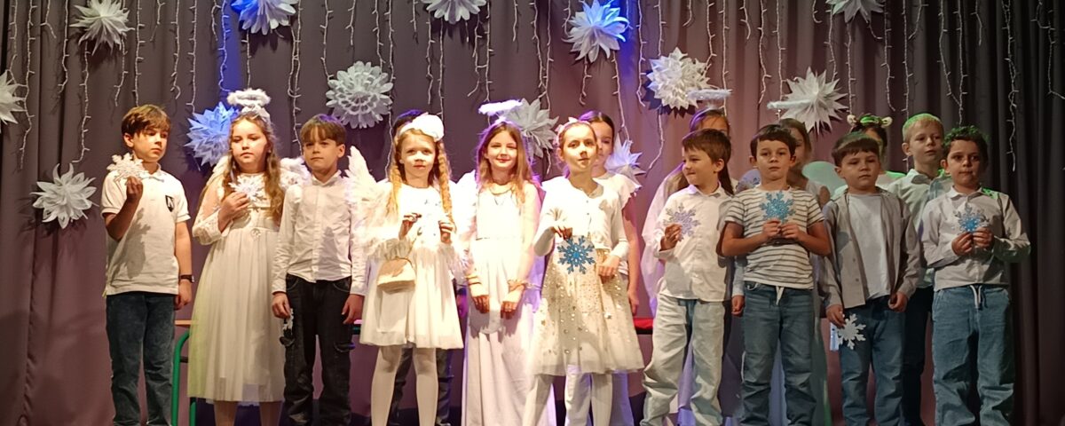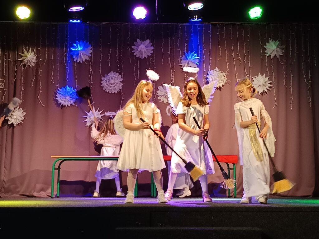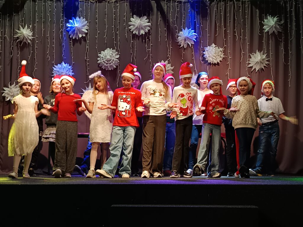 Młodzi artyści z teatralnego kółka klas 2–3 SP przenieśli nas dziś w magiczny świat przedstawienia „Świąteczne zamieszanie”. W ślad za nimi na scenę wkroczyli Nobliści z klas 1–3, którzy rozgrzali serca publiczności radosnymi, anglojęzycznymi śpiewankami i wierszowankami.
