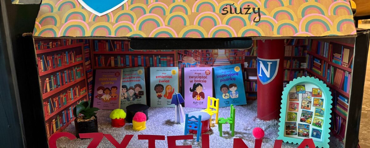 Hol główny szkoły zamienił się w ogromny peron czytelniczych przygód. Każda lokomotywa opowiada własną historię, a każda z nich przypomina, że czytanie to podróż, w którą naprawdę warto wsiąść.